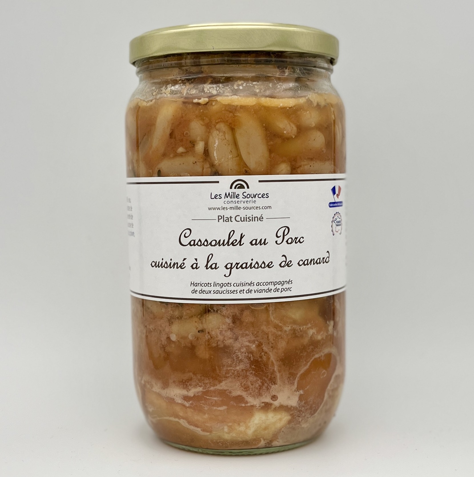 Ingrédients : Haricots lingots cuisinés, saucisse de porc* 26%, viande de porc* 15%, graisse de canard* 2,5%, concentré de tomate, carottes, oignons, ail, sel, poivre, thym.*Origine France