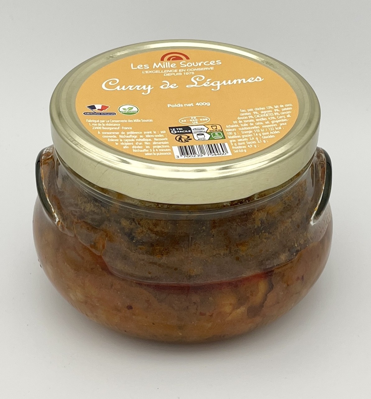 Ingrédients : Eau, pois chiches 12%, lait de coco, carottes 9%, oignons 9%, patates douces 9%, cacahuètes 8%, concentré de tomate, lentilles 4,5%, curry 0,9%, ail, échalote, huile de colza, sel, gingembre.