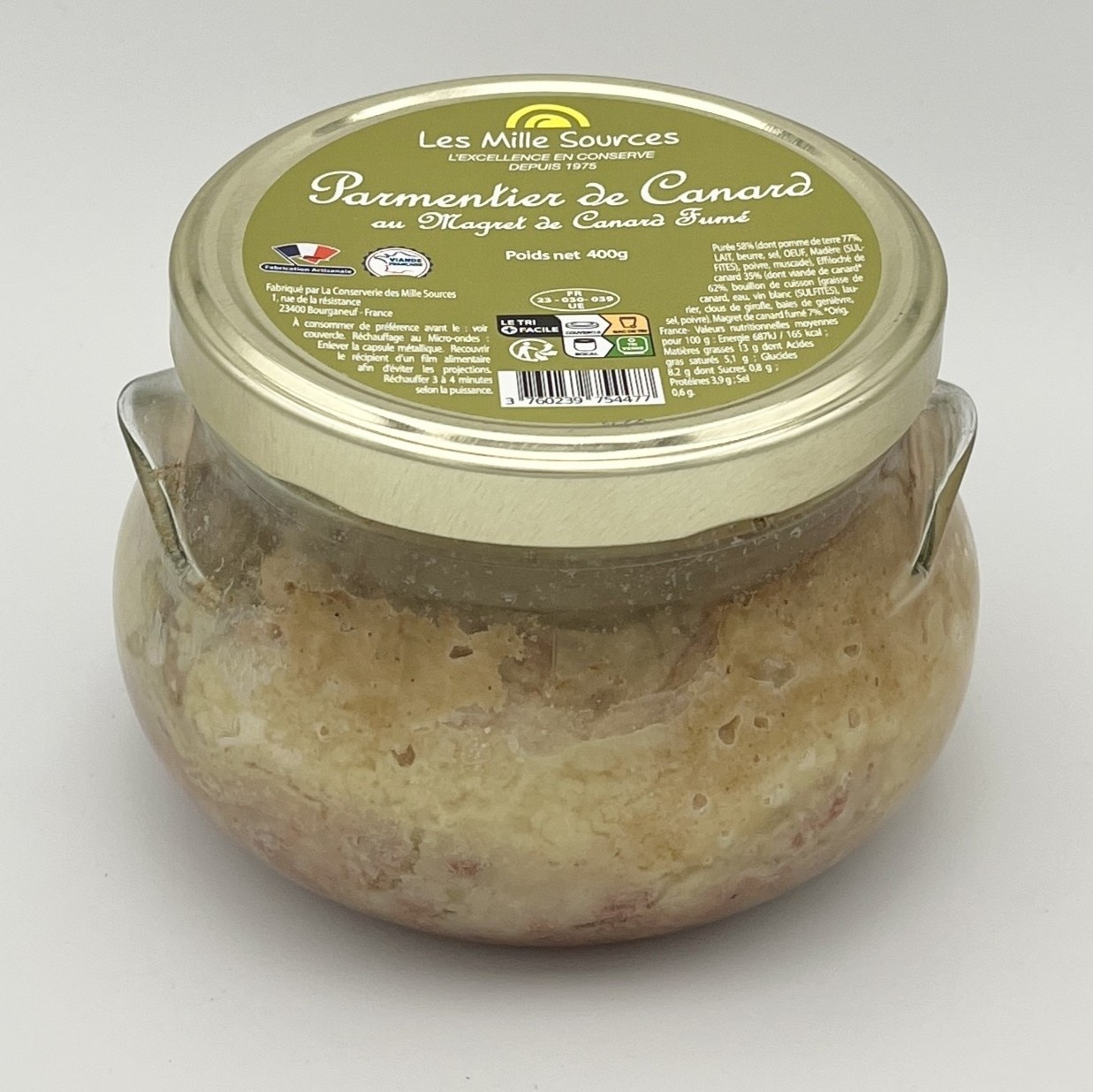 Ingrédients : Purée 58% (pomme de terre 77%, LAIT, beurre, sel, ŒUF), effiloché de canard* 35% (viande de canard 62%, bouillon de cuisson), magret de canard fumé* 7%. *Origine France