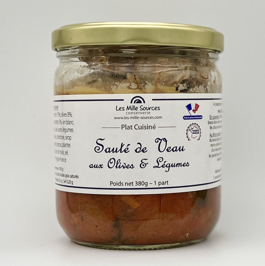 Ingrédients : Viande de veau* 40%, pommes de terre, olives, concentré de tomate, oignons, carottes, vin blanc (sulfites), bouillon de légumes, huile d’olive, ail, fécule de maïs.*Origine France