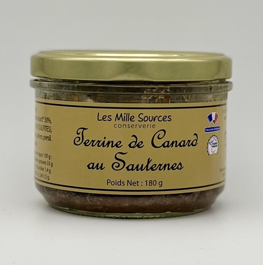 Ingrédients : Viande de porc*, viande de canard* 30%, foie de volaille*, Sauternes 3% (SULFITES), sel, raisins secs, ail, échalote, poivre, persil. *Origine France.