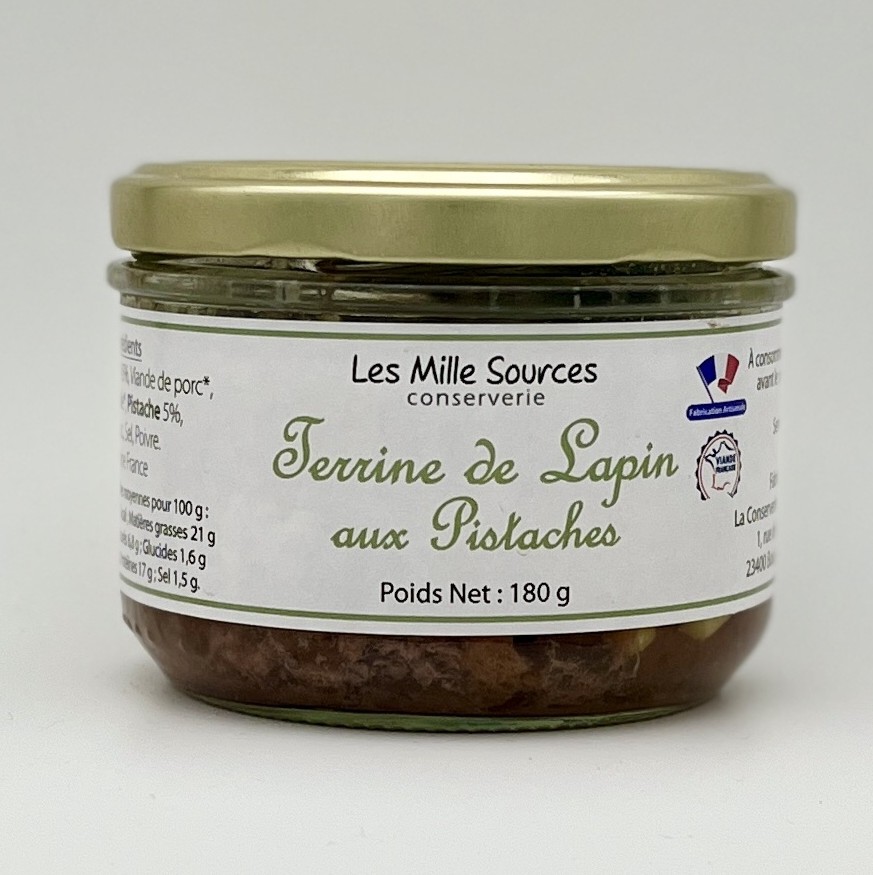 Ingrédients : Viande de lapin* 45%, viande de porc*, foie de volaille*, pistaches 5%. *Origine France.