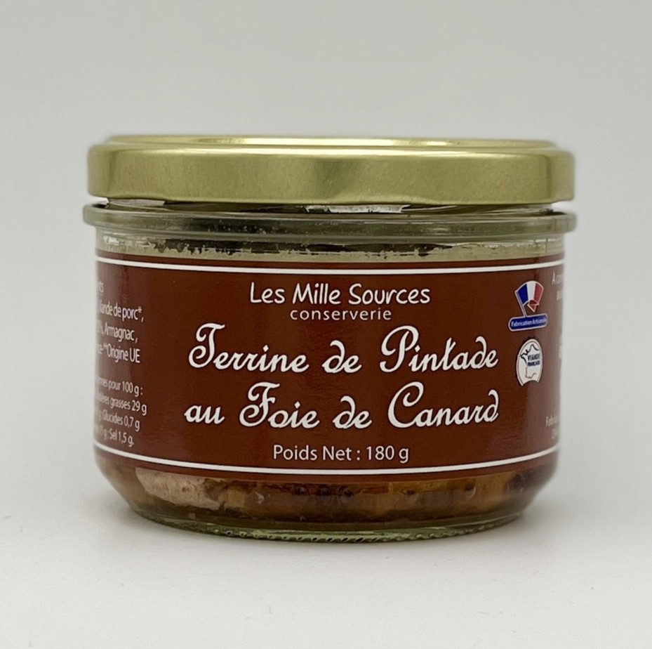 Ingrédients : Viande de pintade* 37%, viande de porc*, foie gras de canard* 20%, Armagnac, sel, poivre. *Origine France / UE.