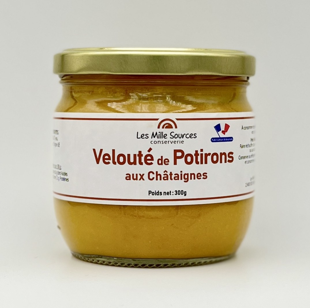 Ingrédients : Potirons 55%, crème, lait, châtaignes 4%, sel, sucre.